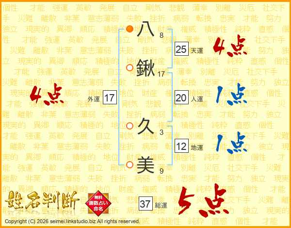 生活面を象徴する運勢です。外部から受ける影響力を表し、結婚運、家庭運や職場、環境への順応性を表します。総運から人運を引いた画数。姓や名が1文字の場合を除く。