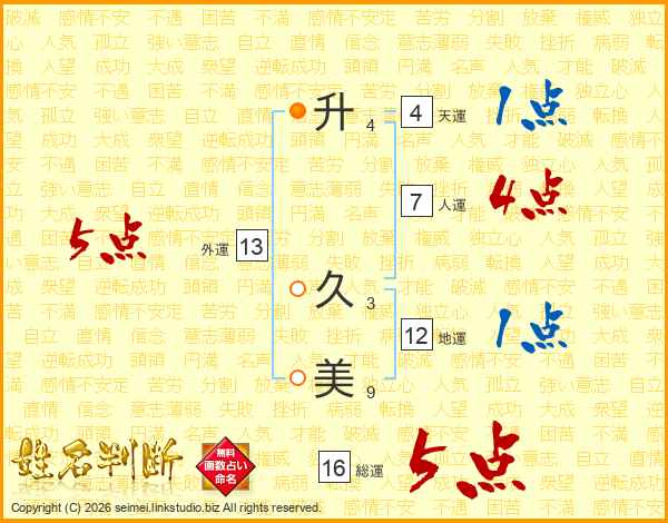 升(4画) 久(3画)美(9画)