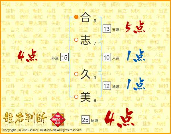 合(6画)志(7画) 久(3画)美(9画)