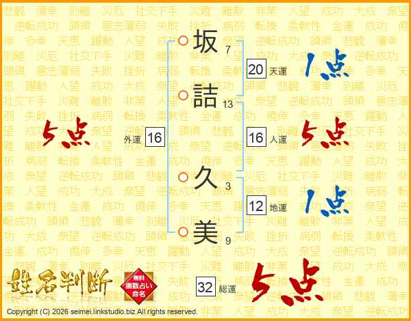 坂詰久美さんの総運は32画の5点!