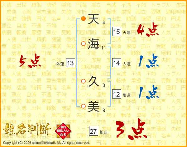 天(4画)海(11画) 久(3画)美(9画)