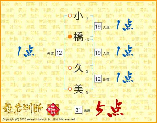 生活面を象徴する運勢です。外部から受ける影響力を表し、結婚運、家庭運や職場、環境への順応性を表します。総運から人運を引いた画数。姓や名が1文字の場合を除く。