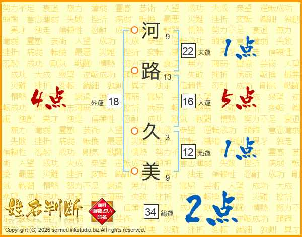 生活面を象徴する運勢です。外部から受ける影響力を表し、結婚運、家庭運や職場、環境への順応性を表します。総運から人運を引いた画数。姓や名が1文字の場合を除く。