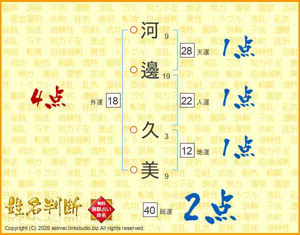生活面を象徴する運勢です。外部から受ける影響力を表し、結婚運、家庭運や職場、環境への順応性を表します。総運から人運を引いた画数。姓や名が1文字の場合を除く。