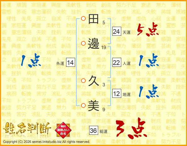 田(5画)邊(19画) 久(3画)美(9画)