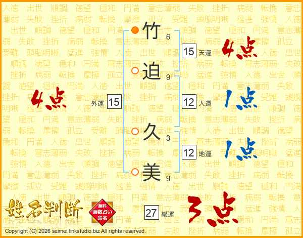 生活面を象徴する運勢です。外部から受ける影響力を表し、結婚運、家庭運や職場、環境への順応性を表します。総運から人運を引いた画数。姓や名が1文字の場合を除く。