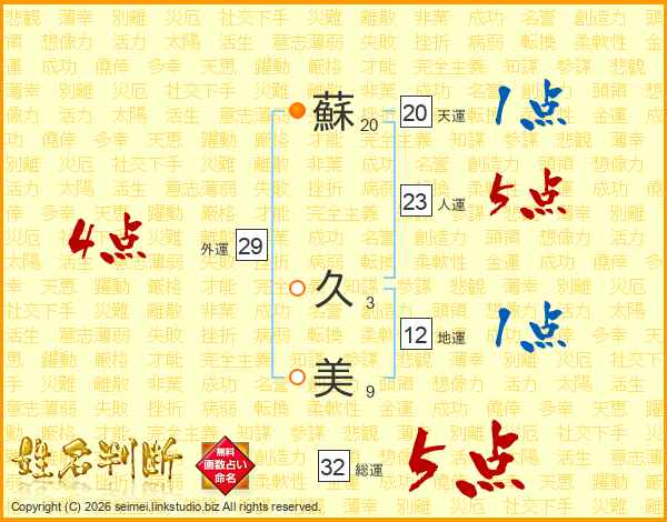 生活面を象徴する運勢です。外部から受ける影響力を表し、結婚運、家庭運や職場、環境への順応性を表します。総運から人運を引いた画数。姓や名が1文字の場合を除く。
