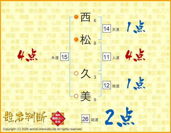 画数の奇数(○陽)と偶数(●陰)の配列で吉凶を占います。どちらかにかたよる名前は大凶名で避ける必要があります。画数の奇数偶数。