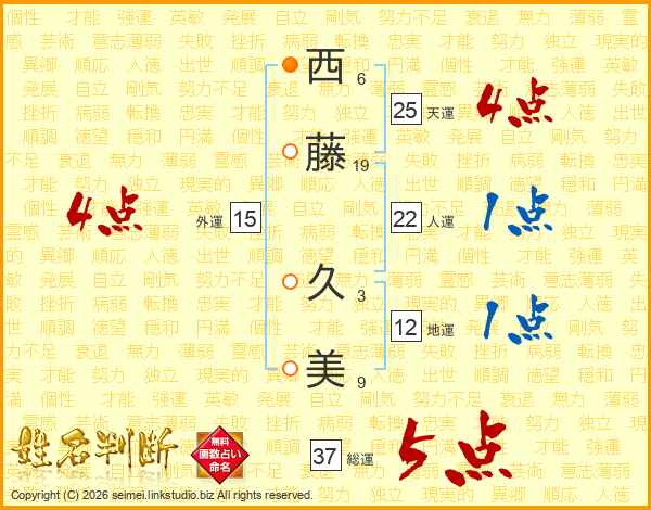 生活面を象徴する運勢です。外部から受ける影響力を表し、結婚運、家庭運や職場、環境への順応性を表します。総運から人運を引いた画数。姓や名が1文字の場合を除く。