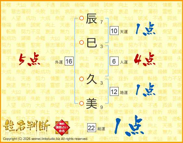 生活面を象徴する運勢です。外部から受ける影響力を表し、結婚運、家庭運や職場、環境への順応性を表します。総運から人運を引いた画数。姓や名が1文字の場合を除く。