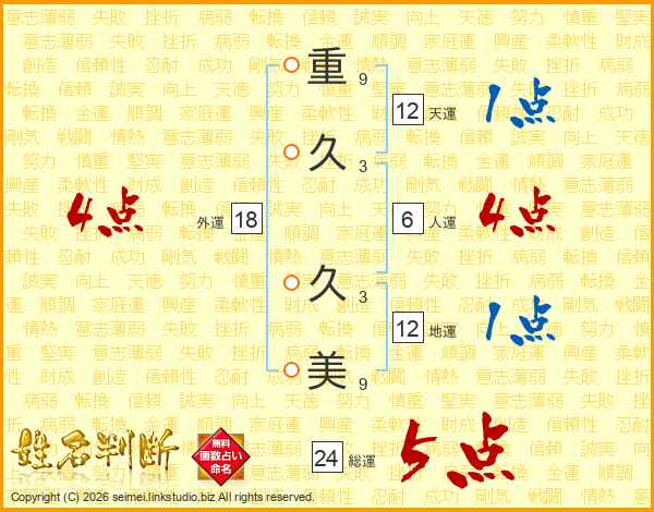 重(9画)久(3画) 久(3画)美(9画)