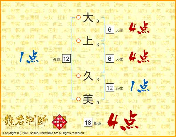 生活面を象徴する運勢です。外部から受ける影響力を表し、結婚運、家庭運や職場、環境への順応性を表します。総運から人運を引いた画数。姓や名が1文字の場合を除く。