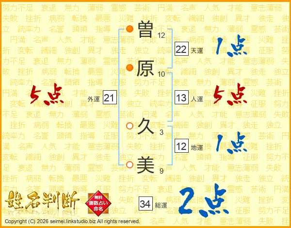 生活面を象徴する運勢です。外部から受ける影響力を表し、結婚運、家庭運や職場、環境への順応性を表します。総運から人運を引いた画数。姓や名が1文字の場合を除く。