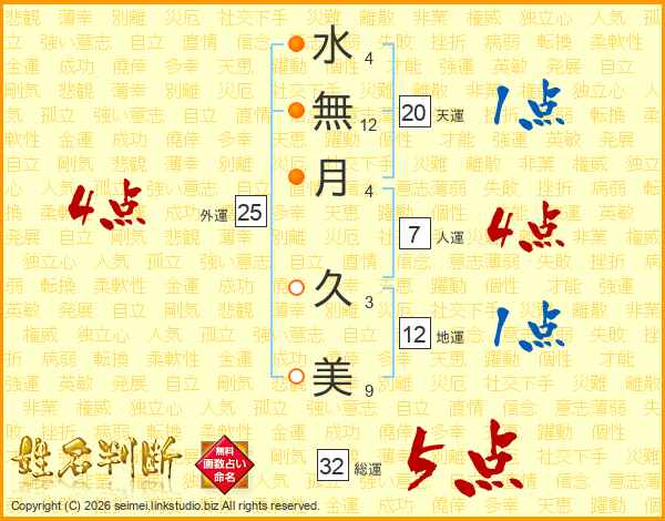 水(4画)無(12画)月(4画) 久(3画)美(9画)