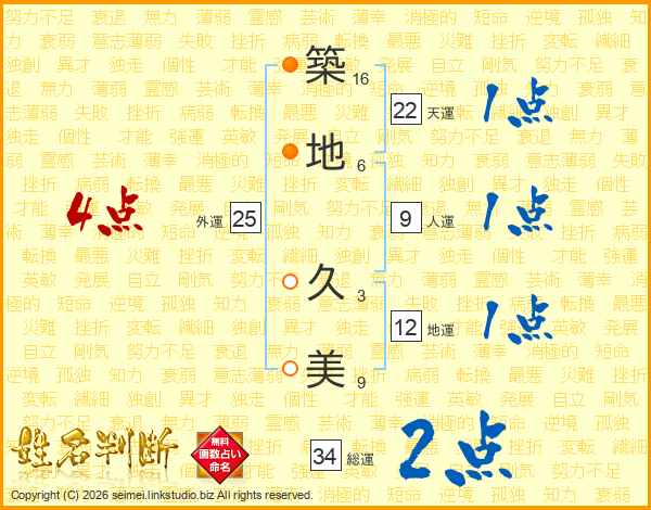 築(16画)地(6画) 久(3画)美(9画)