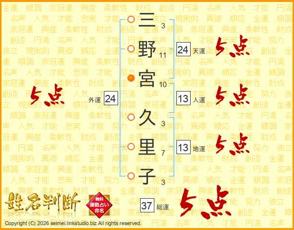 三野宮久里子さんの総運は37画の5点!