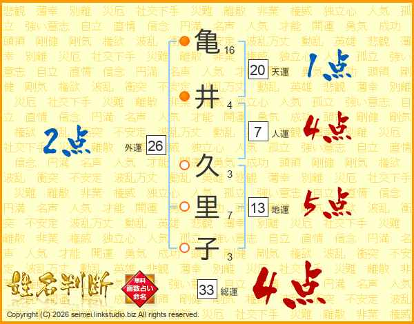 亀(16画)井(4画) 久(3画)里(7画)子(3画)