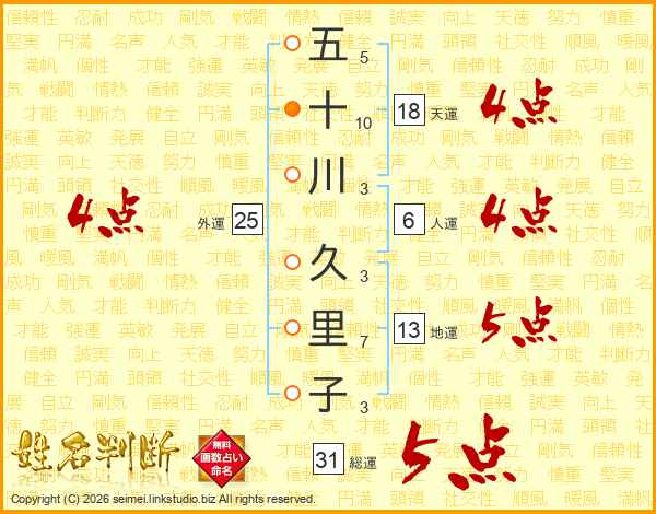 五(5画)十(10画)川(3画) 久(3画)里(7画)子(3画)