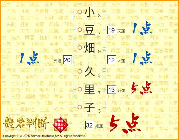 小(3画)豆(7画)畑(9画) 久(3画)里(7画)子(3画)