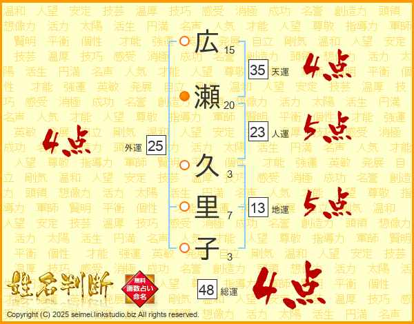 広(15画)瀬(20画) 久(3画)里(7画)子(3画)