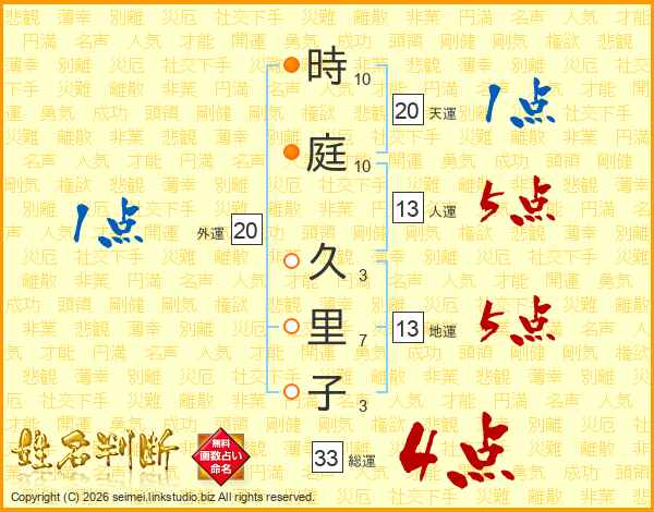 時庭久里子さんの総運は33画の4点!