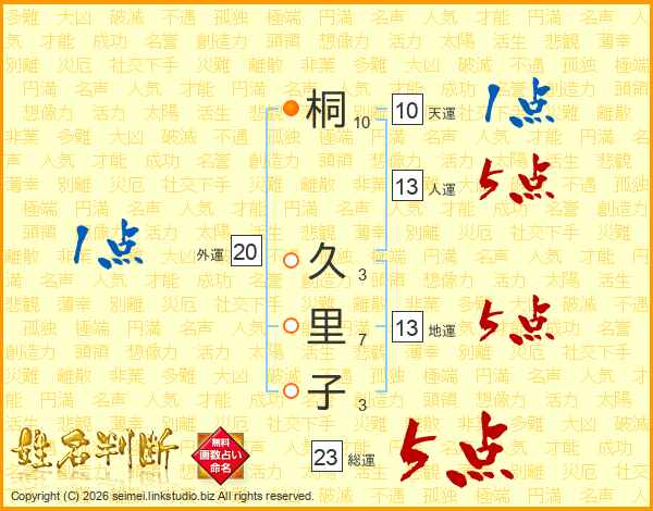 あなたの人生を表す1番重要な運勢です。生涯を通じて影響する総合運となり、主に50歳以降の晩年期に影響を及ぼします。苗字と名前の合計画数。