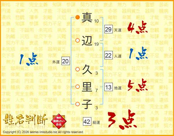 真(10画)辺(19画) 久(3画)里(7画)子(3画)