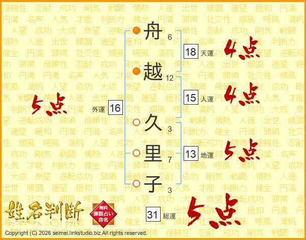 舟(6画)越(12画) 久(3画)里(7画)子(3画)