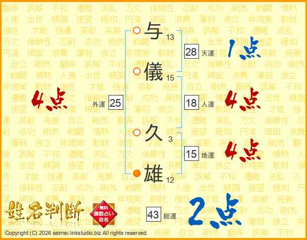 生活面を象徴する運勢です。外部から受ける影響力を表し、結婚運、家庭運や職場、環境への順応性を表します。総運から人運を引いた画数。姓や名が1文字の場合を除く。