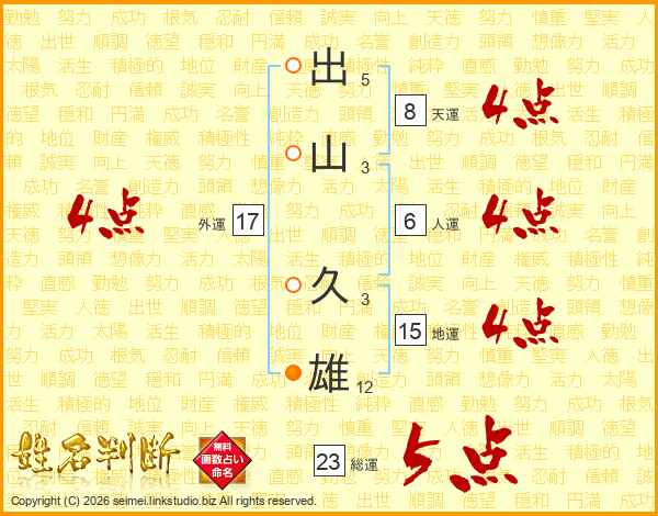 出(5画)山(3画) 久(3画)雄(12画)
