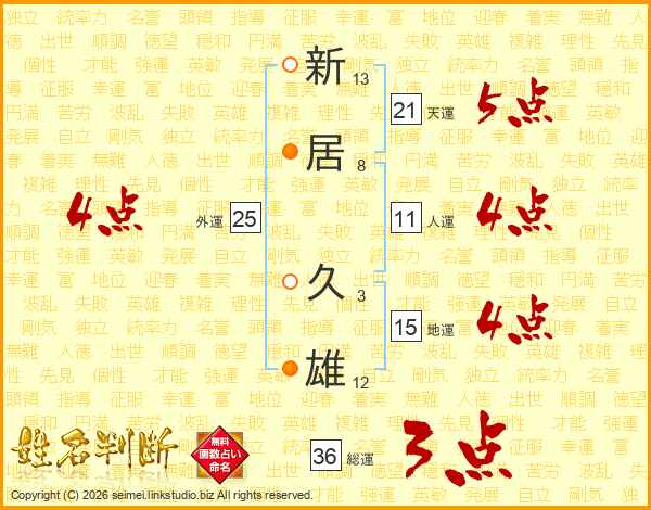 新(13画)居(8画) 久(3画)雄(12画)