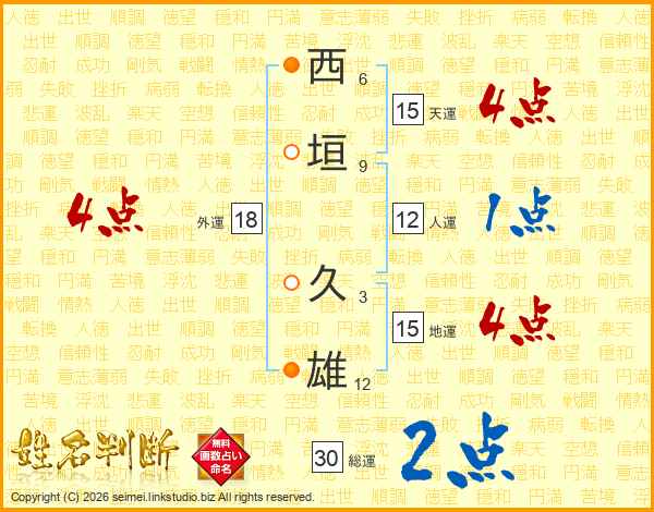 西(6画)垣(9画) 久(3画)雄(12画)