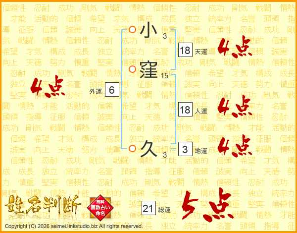 生活面を象徴する運勢です。外部から受ける影響力を表し、結婚運、家庭運や職場、環境への順応性を表します。総運から人運を引いた画数。姓や名が1文字の場合を除く。