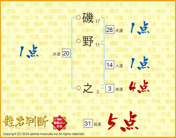 磯野之さんの総運は31画の5点!