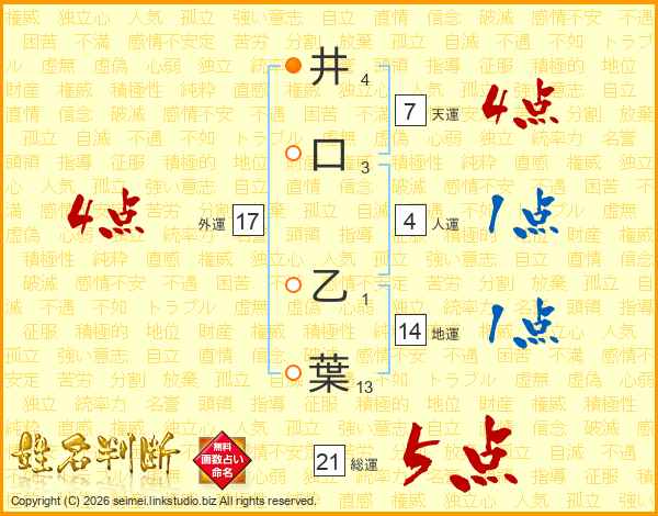 井(4画)口(3画) 乙(1画)葉(13画)