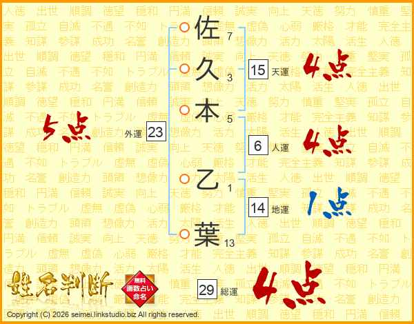 佐(7画)久(3画)本(5画) 乙(1画)葉(13画)
