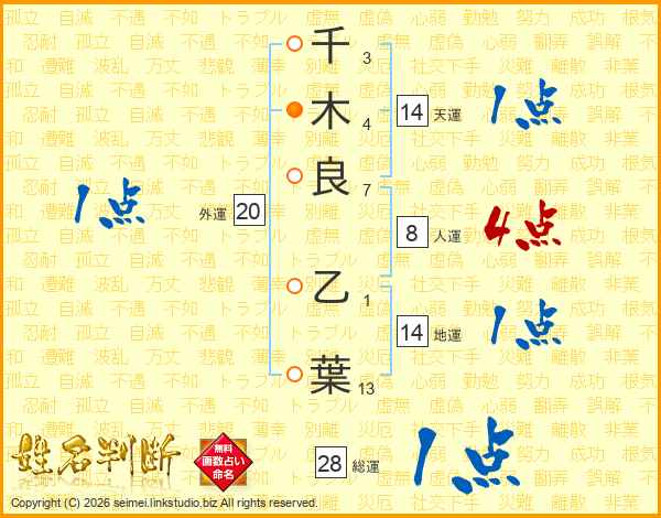千(3画)木(4画)良(7画) 乙(1画)葉(13画)