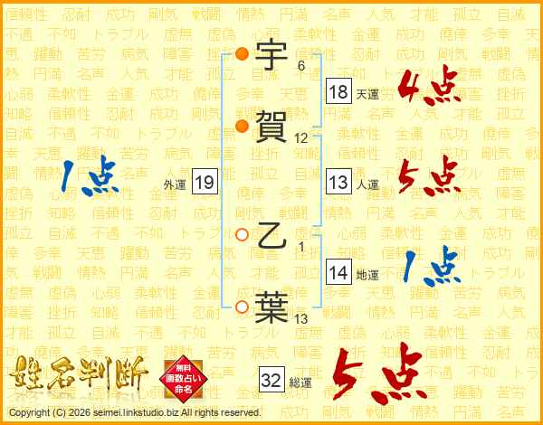 宇賀乙葉さんの総運は32画の5点!