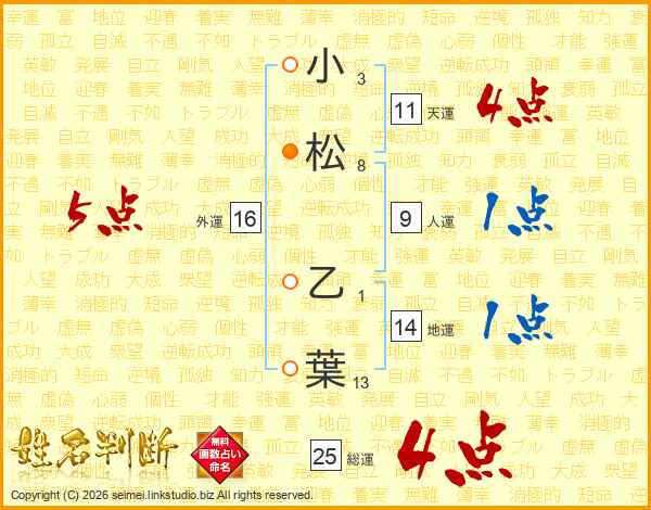 生活面を象徴する運勢です。外部から受ける影響力を表し、結婚運、家庭運や職場、環境への順応性を表します。総運から人運を引いた画数。姓や名が1文字の場合を除く。