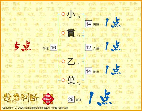 小(3画)貫(11画) 乙(1画)葉(13画)