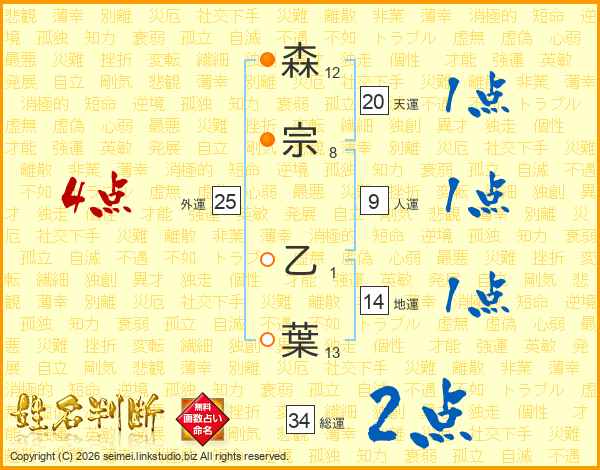 森宗乙葉さんの総運は34画の2点!