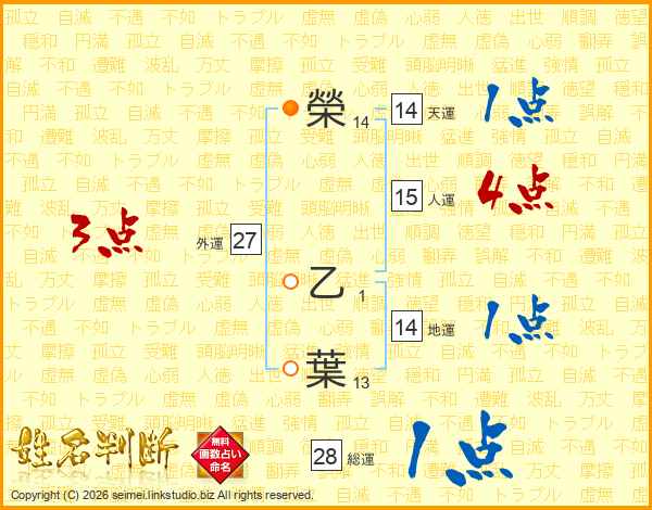 榮(14画) 乙(1画)葉(13画)