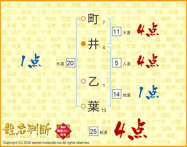 生活面を象徴する運勢です。外部から受ける影響力を表し、結婚運、家庭運や職場、環境への順応性を表します。総運から人運を引いた画数。姓や名が1文字の場合を除く。