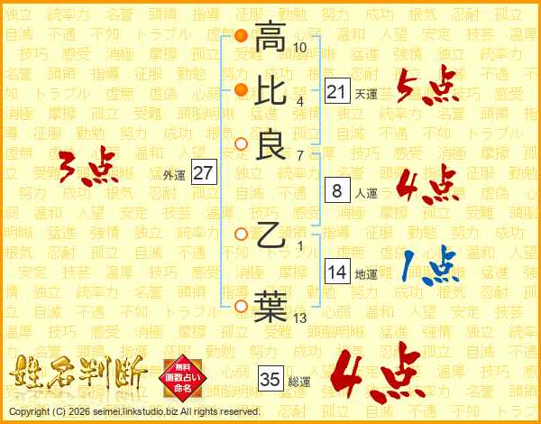 高(10画)比(4画)良(7画) 乙(1画)葉(13画)