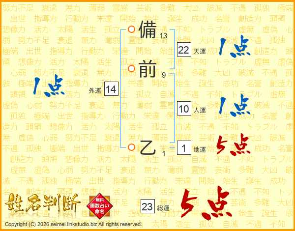 備前乙さんの総運は23画の5点!