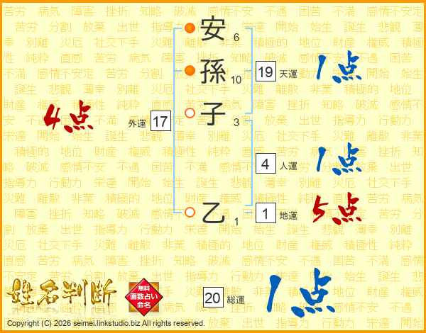 生活面を象徴する運勢です。外部から受ける影響力を表し、結婚運、家庭運や職場、環境への順応性を表します。総運から人運を引いた画数。姓や名が1文字の場合を除く。
