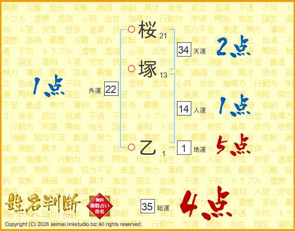 あなたの人生を表す1番重要な運勢です。生涯を通じて影響する総合運となり、主に50歳以降の晩年期に影響を及ぼします。苗字と名前の合計画数。