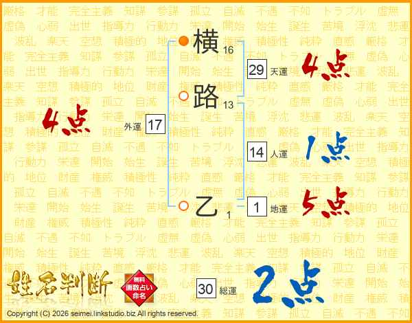 生活面を象徴する運勢です。外部から受ける影響力を表し、結婚運、家庭運や職場、環境への順応性を表します。総運から人運を引いた画数。姓や名が1文字の場合を除く。