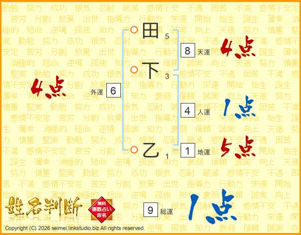 生活面を象徴する運勢です。外部から受ける影響力を表し、結婚運、家庭運や職場、環境への順応性を表します。総運から人運を引いた画数。姓や名が1文字の場合を除く。
