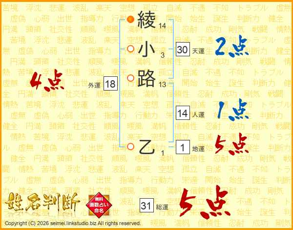 生活面を象徴する運勢です。外部から受ける影響力を表し、結婚運、家庭運や職場、環境への順応性を表します。総運から人運を引いた画数。姓や名が1文字の場合を除く。